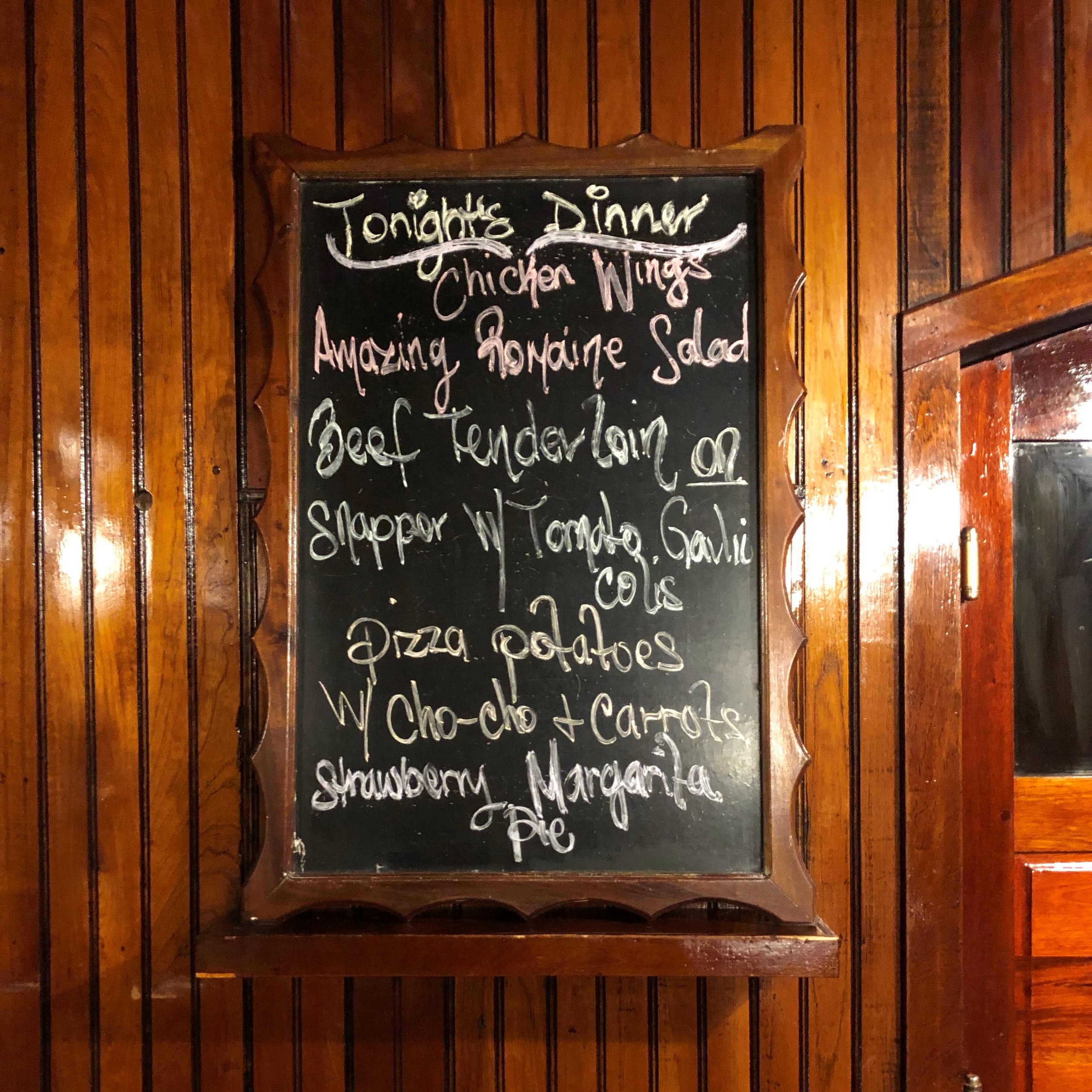 Dinner consists of 2 courses and there are always 2 options for the main course, the menu is always on display in the dining room. I am allergic to seafood and they are very sensitive to food allergies as long as you tell them ahead of time. All the food I ate on the island was very fresh and tasty not to mention the desserts, which were heavenly.